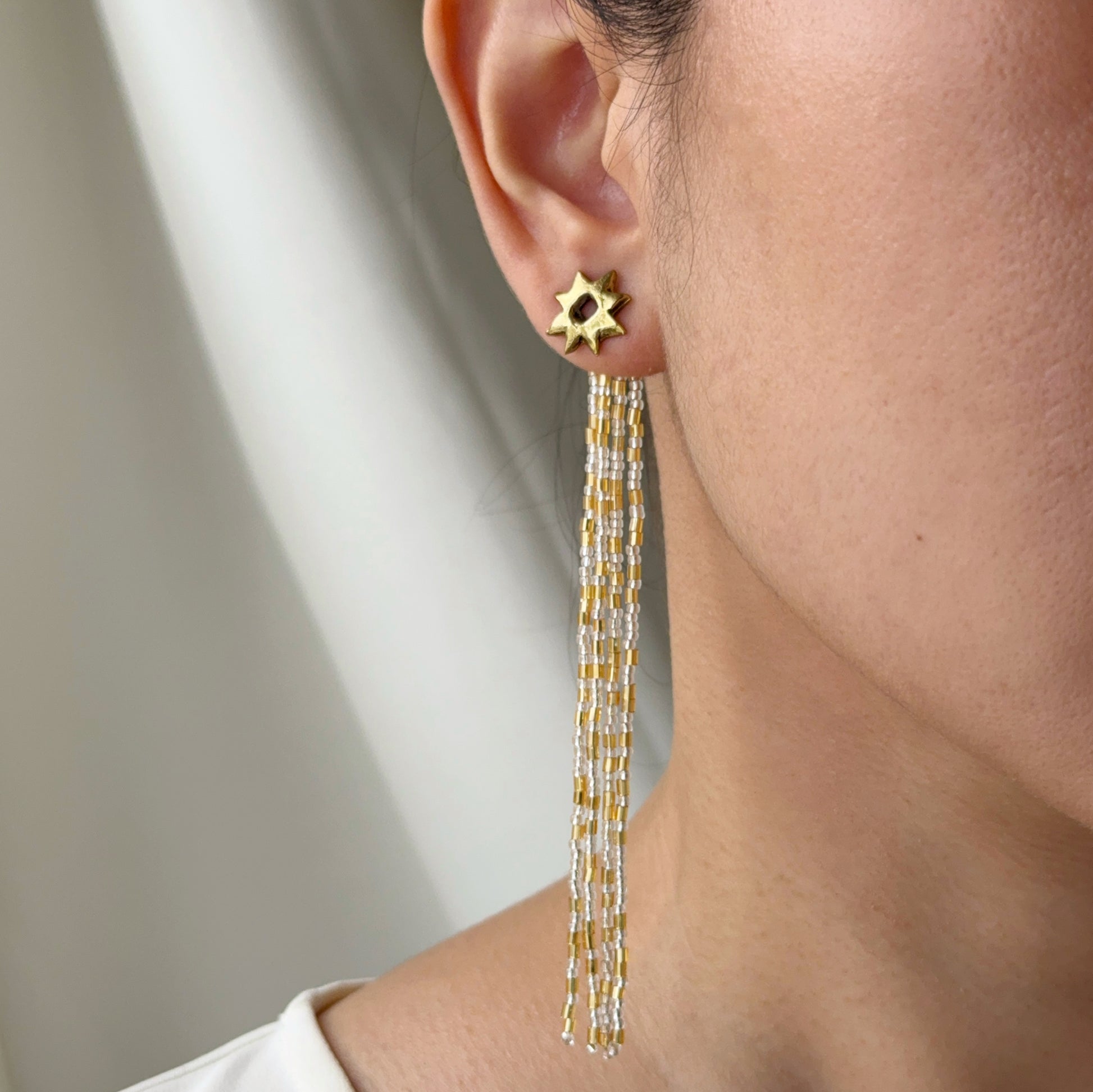 The Bituon Ear Jackets are inspired by the star motifs found in traditional Filipino weaves from Luzon and Mindanao. This pair is the perfect day-to-night pair: wear them as simple studs or add on the fringe for glamour and drama!